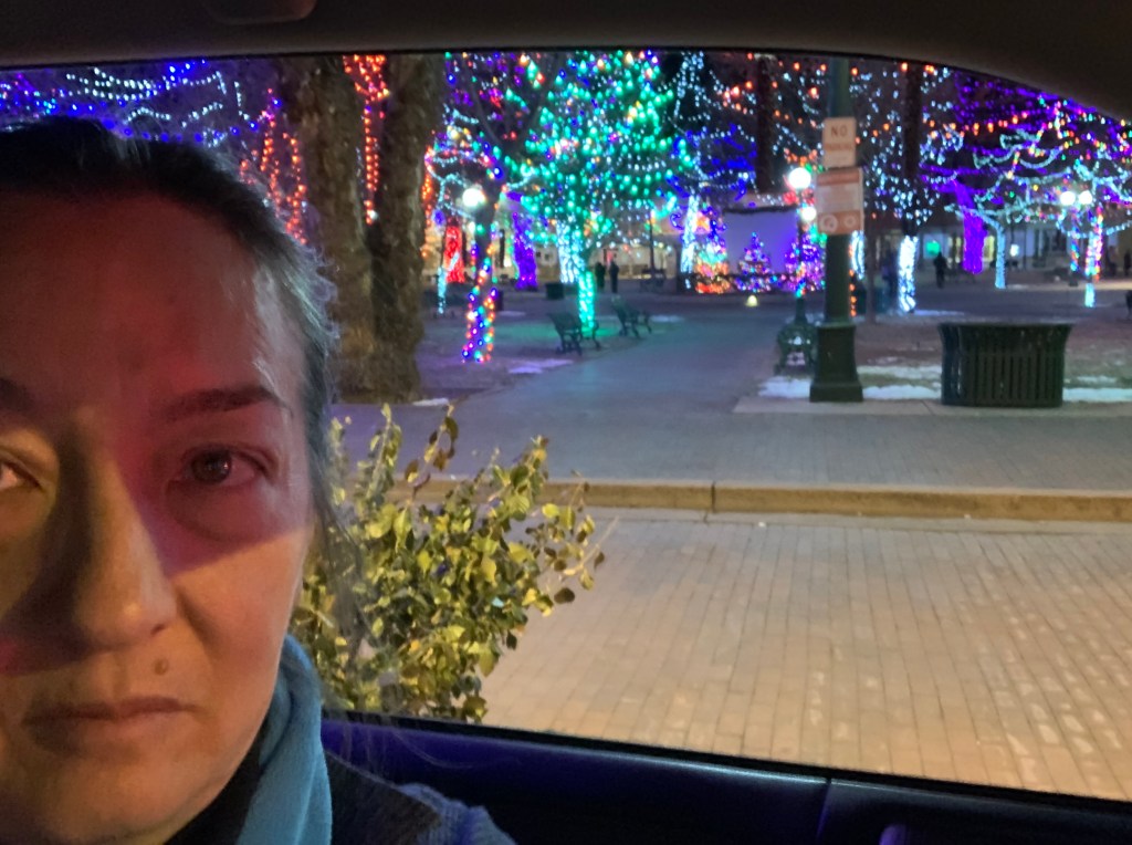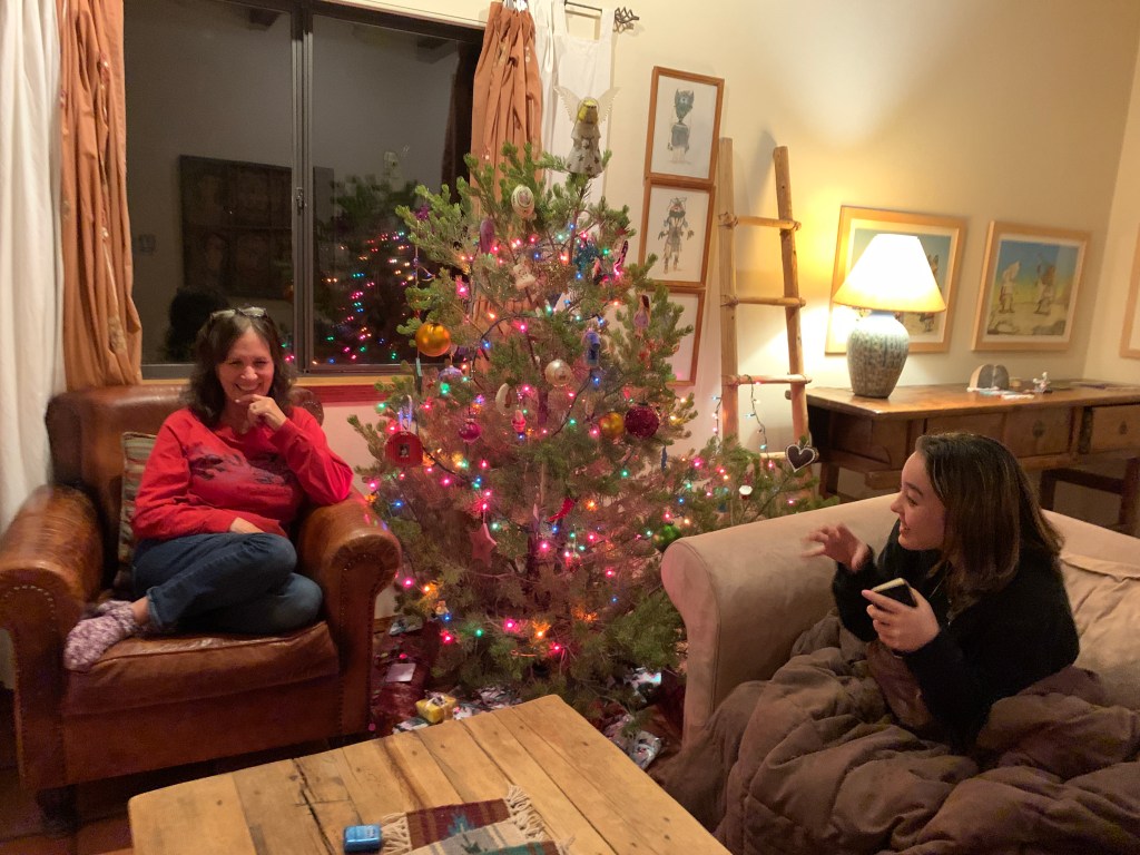 Last week, we trekked out to Santa Fe, got caught in a storm, had a white Christmas, saw the luminarias and did Ten Thousand Waves under a full moon. Nell discovered snowboarding. I got a CMU School of Drama hoodie. Santa put a bottle of wine in my stocking. Sam got me 2 Woodstock vintage vinyl’s (I am listening right now).  And we got through Christmas quietly, with all its triggers. Sam & I even made it through the last 90 minutes of a 15-hour car ride (barely). I am truly blessed. I got a lot done this year. I traveled to Spain. I finished my documentary. I took it to festivals in San Antonio, Ft Lauderdale and Vail. I even got a little trophy. I worked on Barbie reshoots before the strike. Still, a pile of shit happened this year. We were not in a direct line of fire, but we felt the pangs, as well as our special powers.
