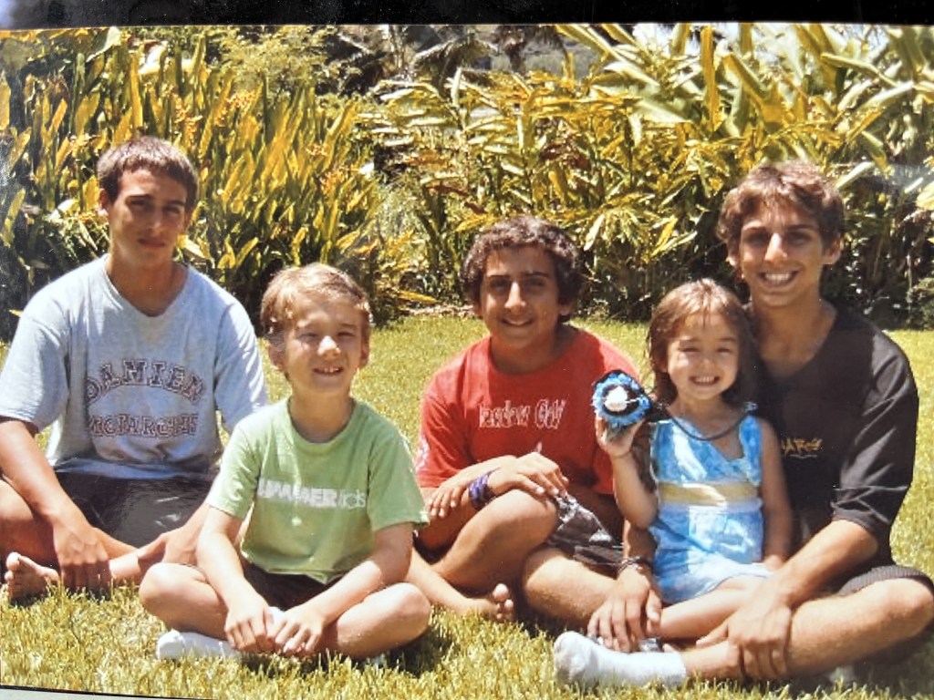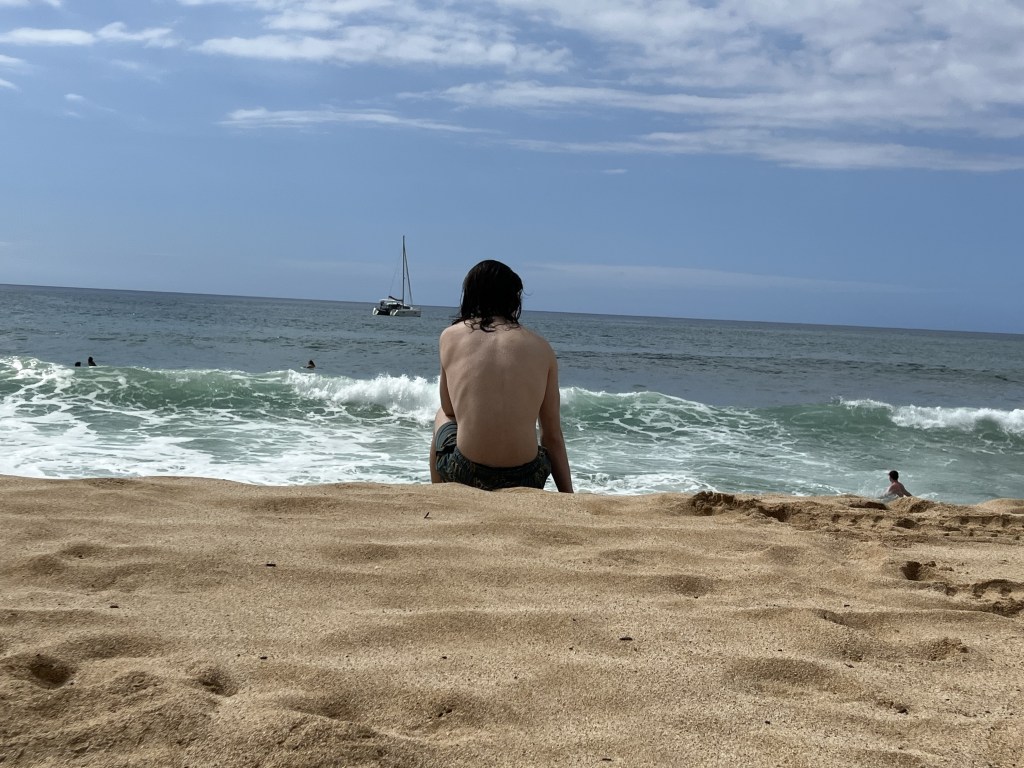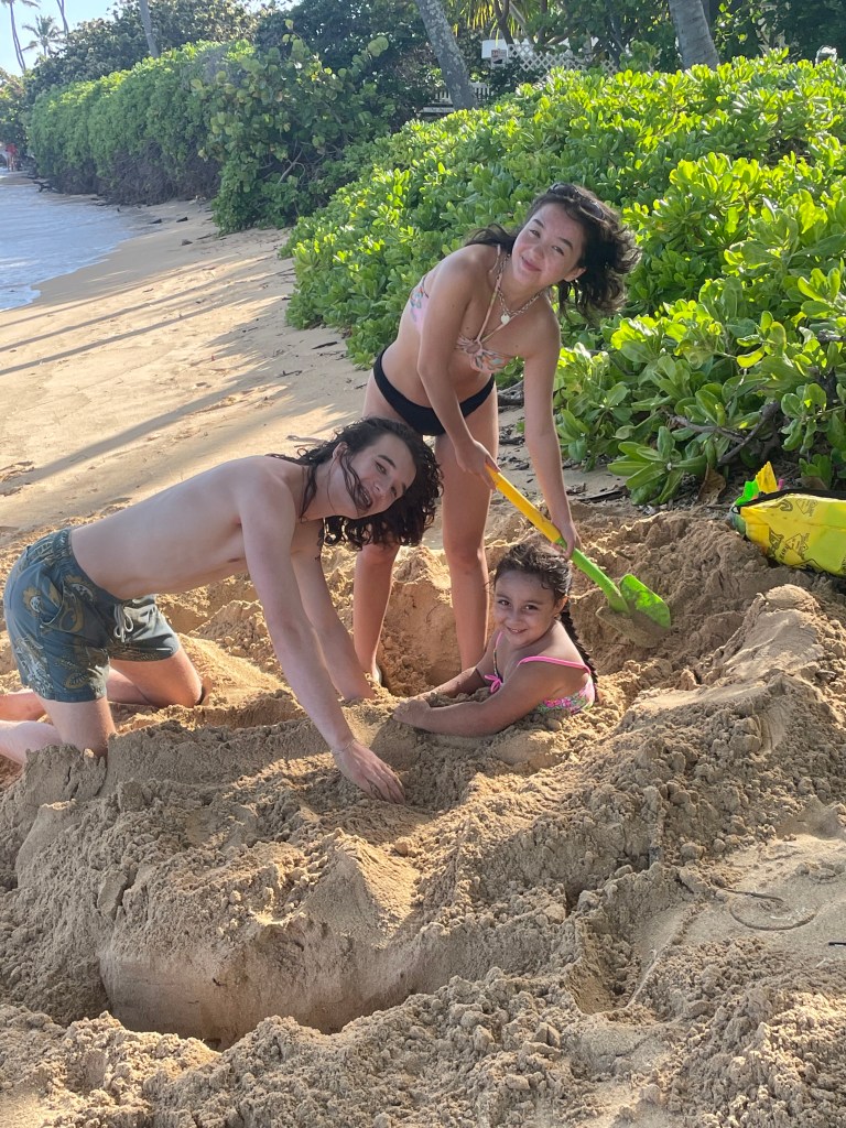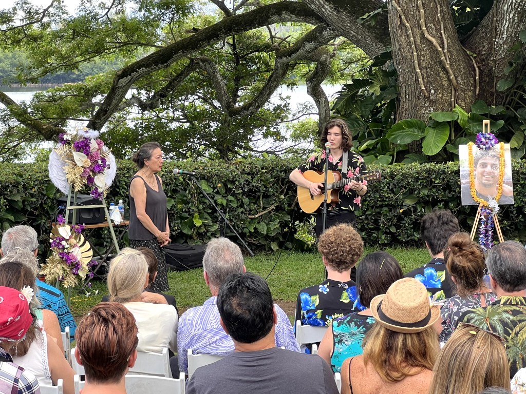 Nell came to Oahu for spring break.  She was the first boots on the ground.  Then I showed up with my bad arm.  In April Sam met me there, and brought his guitar, and we sang a duet, Blackbird, at the service. We watched a line of boys in their 20s say goodbye to their brother, their childhood friend, beautiful Kaneohe Bay behind us all, Leslie wailing throughout.  In July we three came again, with our friend Oshy. We had all forged relationships with Leslie and Eddie –once separated, then back together, then divorced, back together, now grieving hard. With their granddaughter, Kora, we dug a hole at the beach and played chase in the yard.