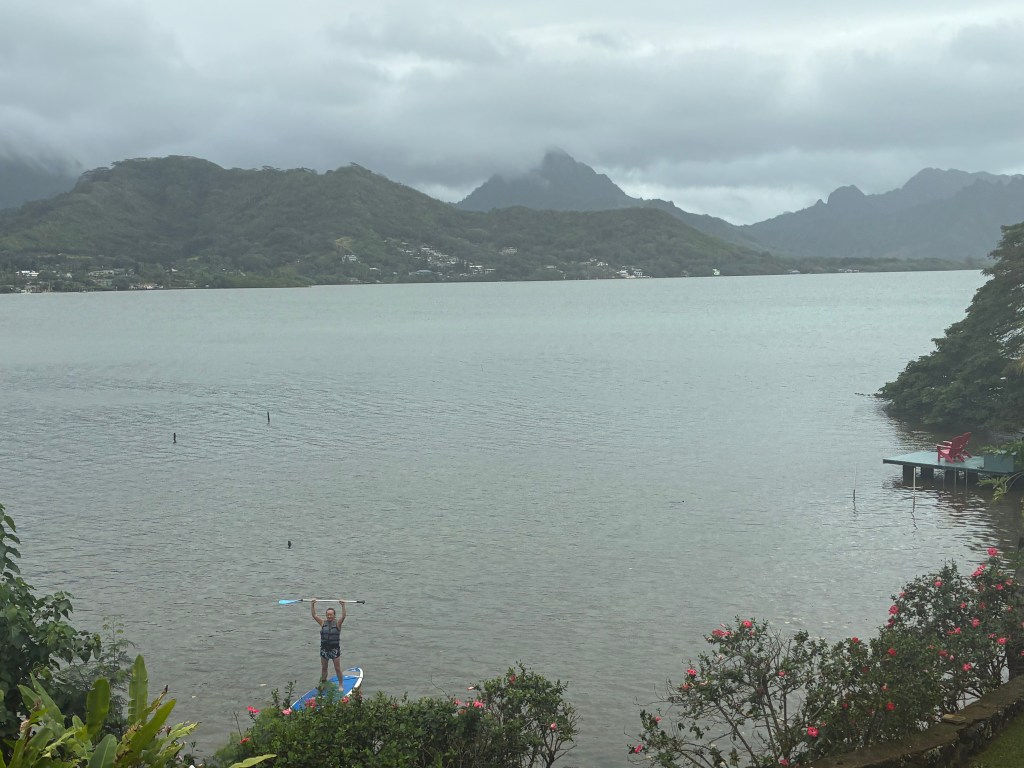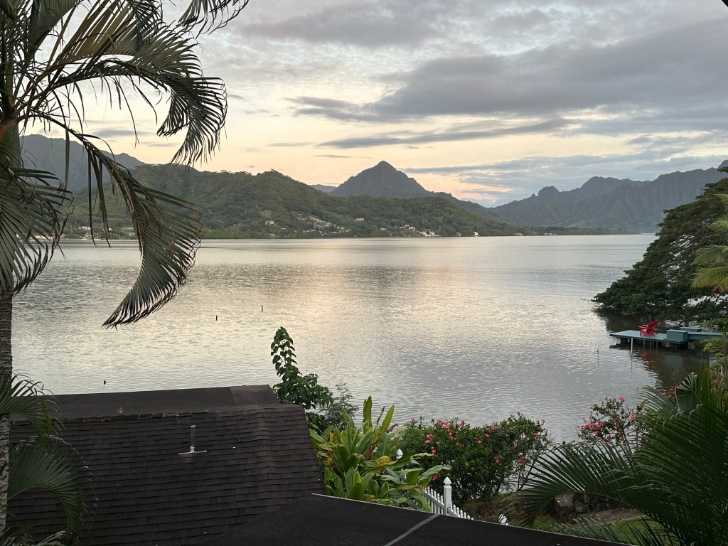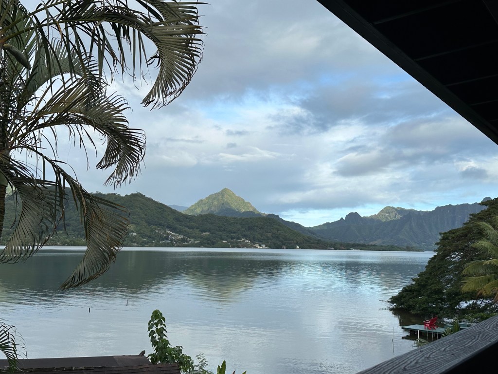I’m actually on windward Oahu as I write this.  We decided to take a break from Santa Fe this time and be with the Hawaii cousins.  Excellent move.  I found this little resort with a view of the bay where I am enjoying the sounds of birds, rain falling, and undaunted kayakers in the water below. Fresh water coming down from the mountains meets the ocean in this quiet bay, with mostly local residents surrounding.