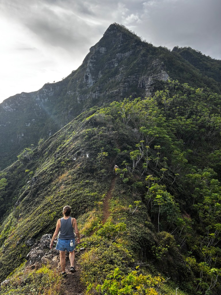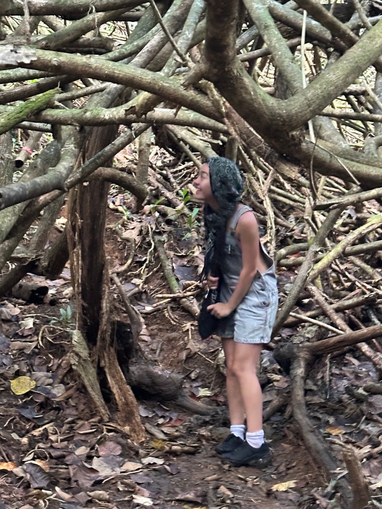 Yesterday (Christmas Day) we hiked Kahana Valley, barely making a dent in the enormous natural reserve that is probably not what most folks think of when they think of Oahu.  It goes way, way back and, bedraggled and mosquito bitten, we never did reach our destination, a legendary ice pond, but we were content to explore this spectacular jungle in between 2 mountains, just a mile and a half from Leslie’s place.