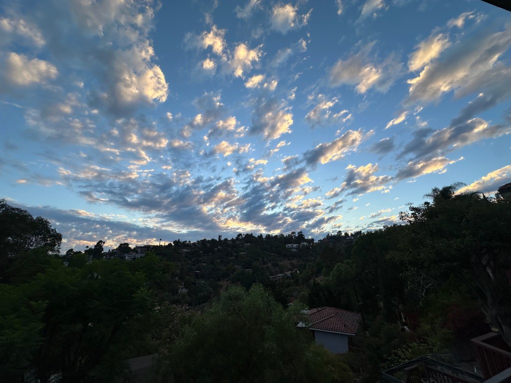 I’m doing great.  I really am. The house did not burn down, so right there how fortunate am I. I helped a friend mount his play at the Edinburgh Fringe.  I helped another on the verge of homelessness file for social security.  I housed a displaced Eaton Fire victim for months, and helped a Palisades fire friend with his inventory.  Five members of my family joined me in Scotland. And the only people I personally know who have been nabbed by ICE agents are co-workers of friends.  All my peeps are safe. Nell is positioned to graduate college in 4 months and 7 days with a BFA from a celebrated performing arts institution.  Sam (now Samantha) is making a living in New York as a lighting technician Off-Broadway, while playing keyboards in a band and composing.  At the risk of turning my luck, let me say that I am feeling pretty good these days. Not exactly happy, but when I stop to think about it, I feel alright. A new job in house with Amazon Studios (so much for giving up my Prime account as a new years resolution).  It’s little quiet – dare I say lonely– working from my house, but, man, best office view ever.  Two theatre projects on the horizon, and more if I get my shit together with 2 scripts. Unfortunately, the dog is withering, but it’s natural and he’s so sweet.  I’m battening down the hatches for the torrents of rain headed our way.  New roof, new gutters, and finally fixed that crack in the foundation that brought water into the basement.  I planted a native garden last week (bucket list).  And did someone say retirement in a couple of years?  There is uncertainty, but for the most part I am safe.